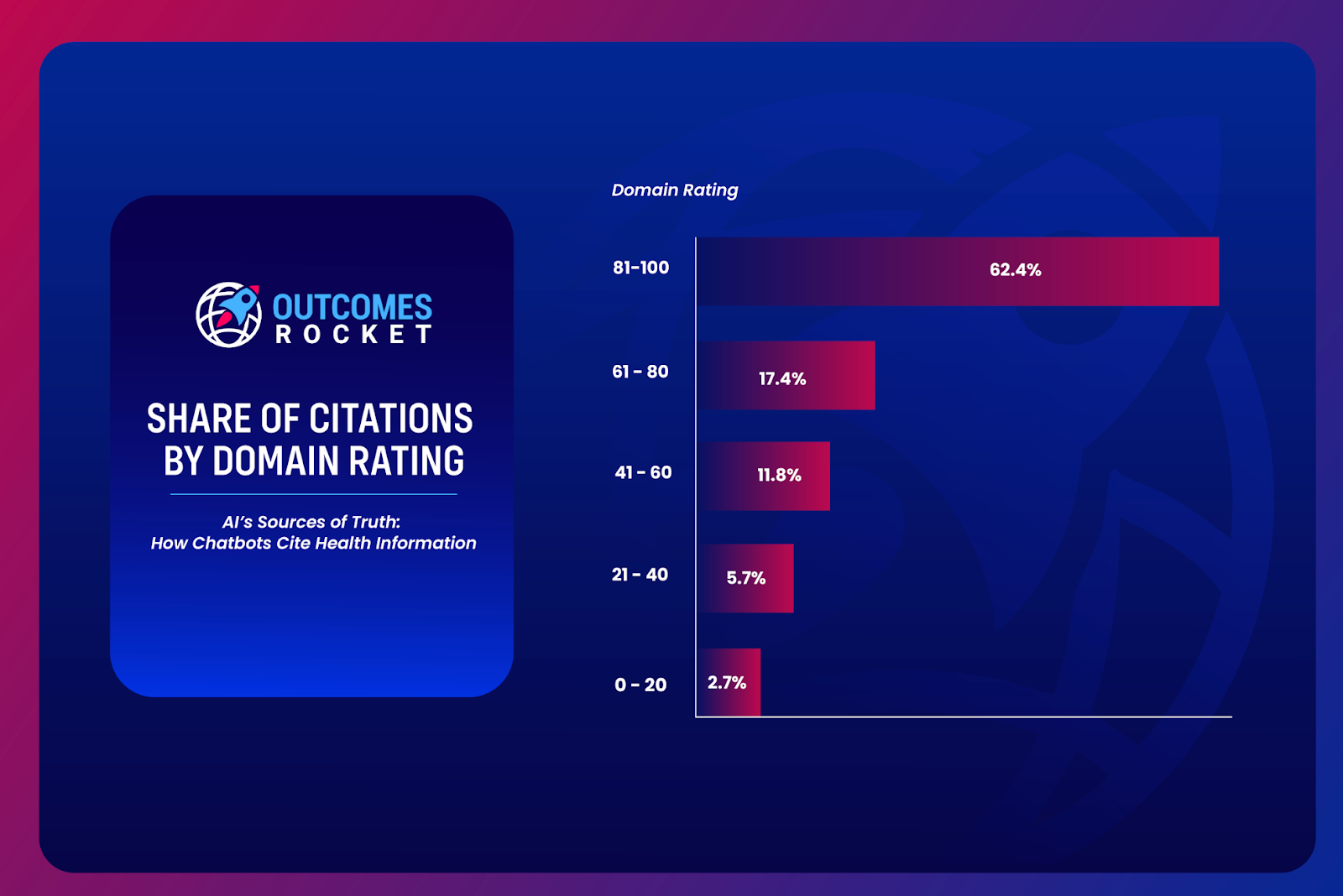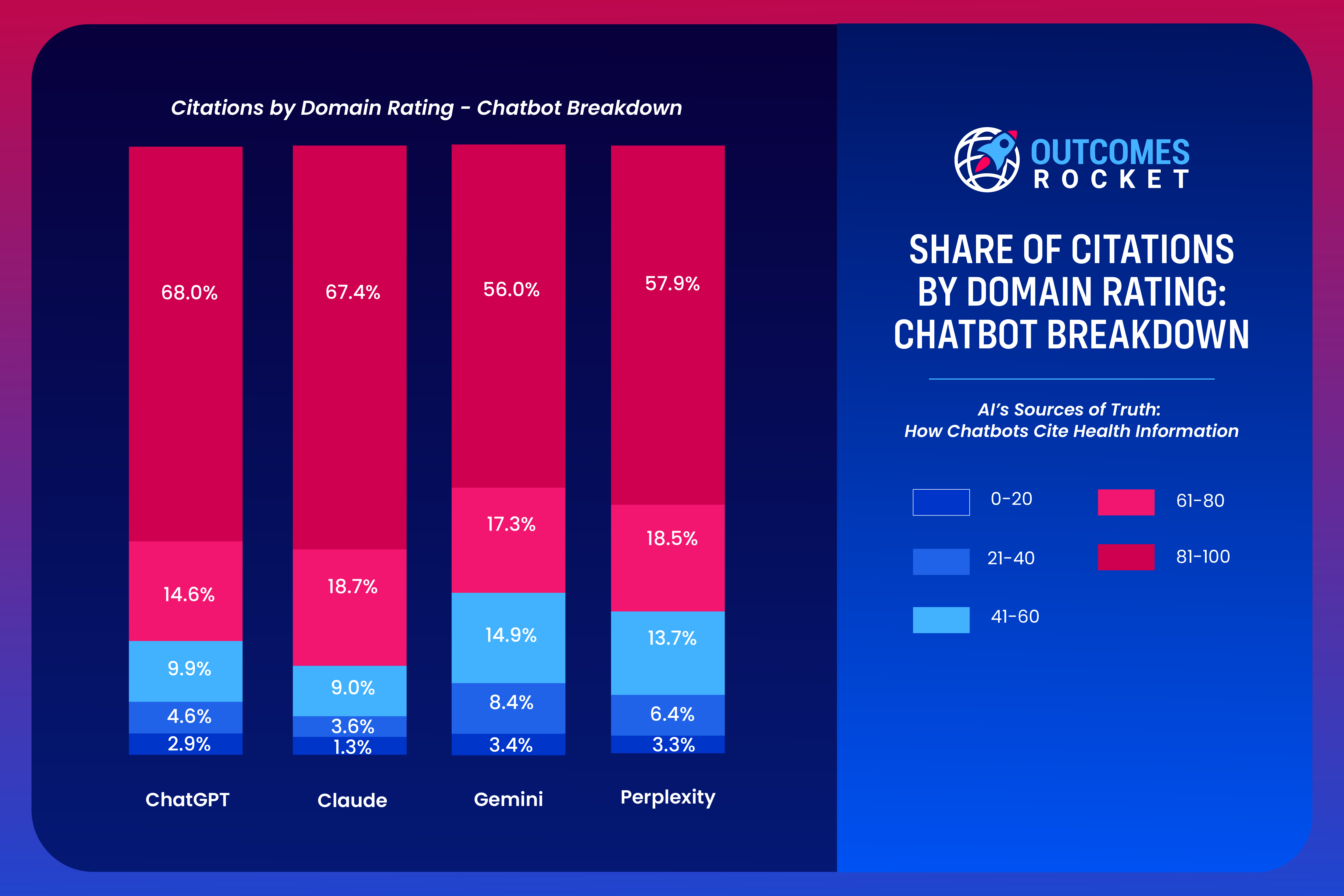 When it comes to credibility, Domain Rating (DR) scores provides a useful lens. The data reveals that 62.4% of all citations originate in domains with the highest authority ratings (DR scores 81-100). NIH, PubMed, and Mayo Clinic are some of the sites users tend to instinctively trust. By contrast, only 2.7% of citations are from the lowest tier of authority (DR 0-20), where reliability is most questioned.