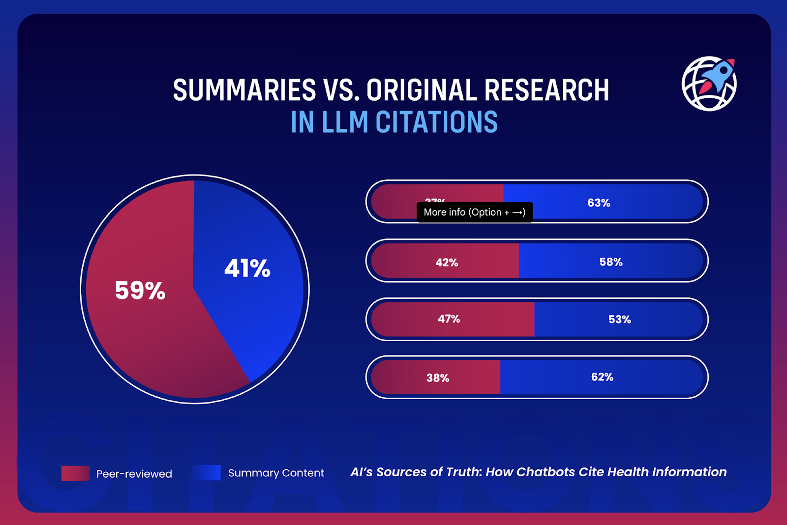 The preference is the most obvious in ChatGPT, which draws 62% of its citations from summaries and only 38% from research articles. Perplexity is almost the same, with 63% summaries and 37% peer-reviewed, showing a clear bias towards consumer-friendly explanations. Claude has the highest rate of peer-reviewed citations at 47%, while Gemini is positioned in a better balance, with 58% summaries and 42% research sources.