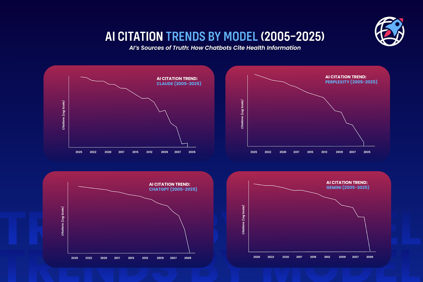 That said, evidence also suggests LLMs tend to favor a small, concentrated group of highly trusted domains. Ranked far higher than the other citations, PubMed Central dominates this group underscoring AI’s heavy reliance on peer-reviewed, open-access research. Institutional health media, Cleveland Clinic (174 mentions) and Mayo Clinic (163), play a prominent role in this grouping reflecting a strong preference for patient-friendly, medically reviewed resources. This group rounds out with the Government-backed NCBI database (150) reinforcing credibility with official, authoritative references.
