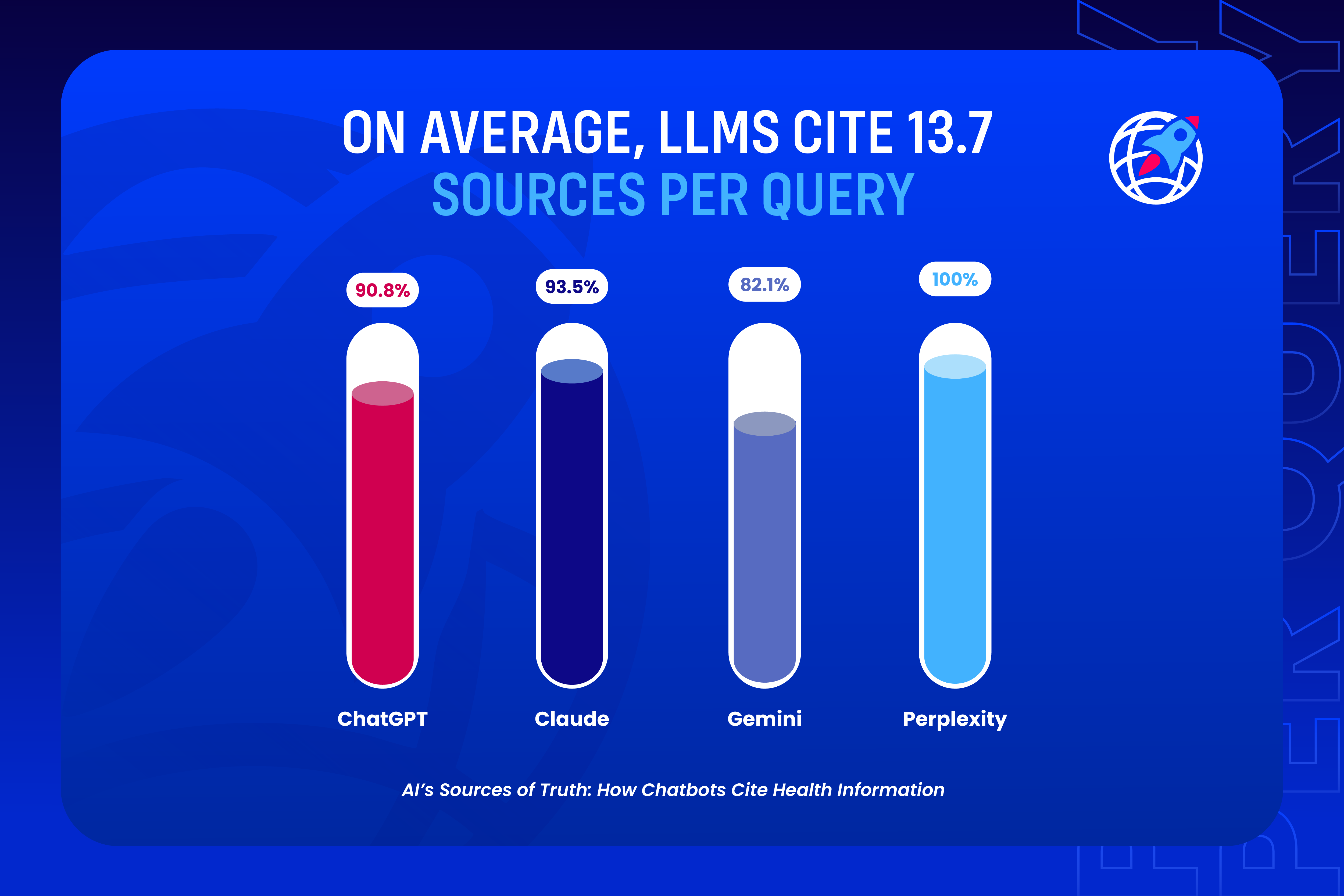 Perplexity, which ranks last in terms of high-quality citations, ranks first in the volume of citations, averaging 14.97 citations per query. Its approach represents a philosophy of abundance, drawing from a broad array of sources: commercial sites and even user-generated content are incorporated to give a more complete picture. Coming second at 13.99 is Claude, which provides a more even balance of academic, government, and health media references. These are followed by ChatGPT with 13.59, and then Gemini with 12.29 citations per response.